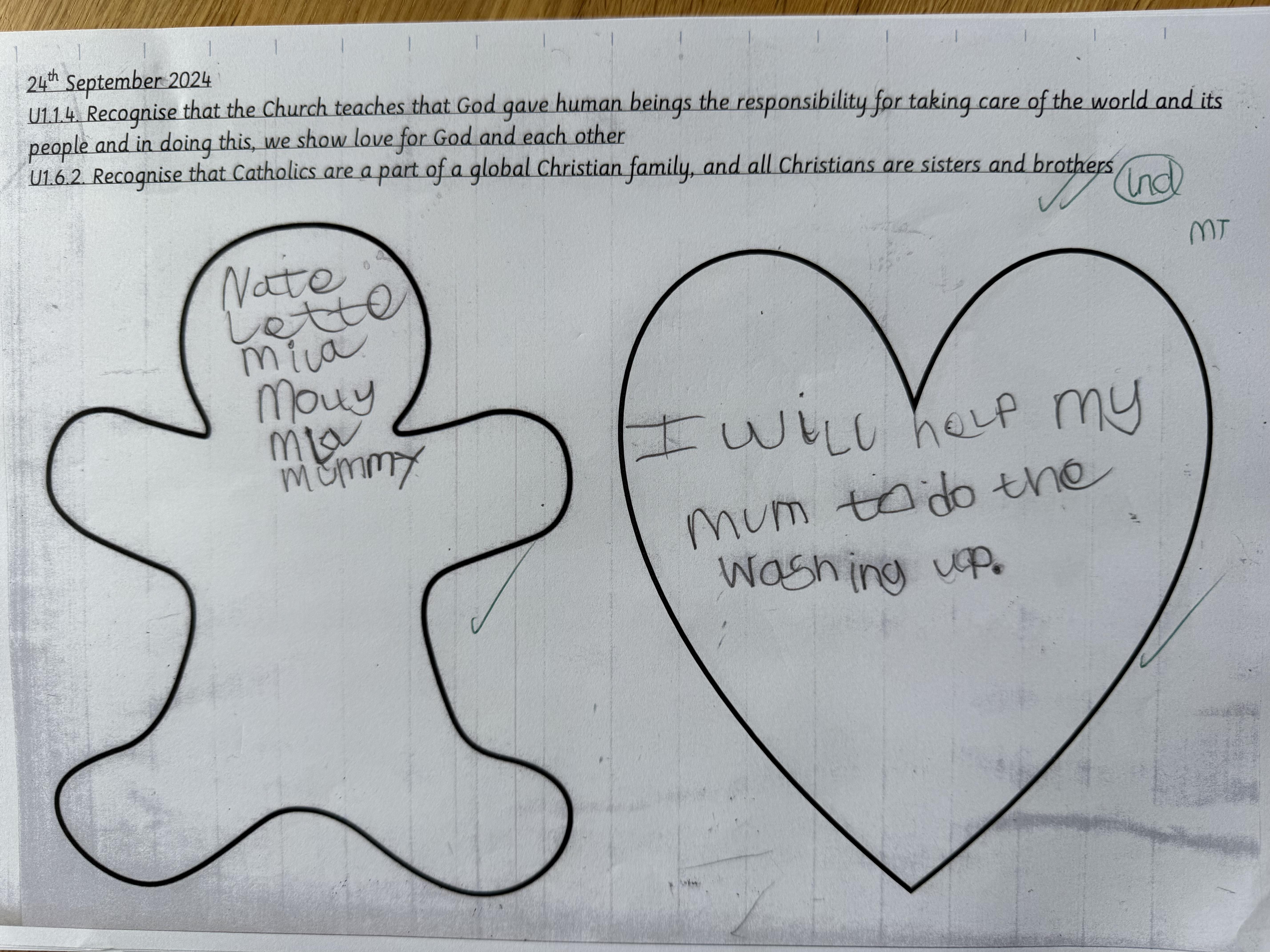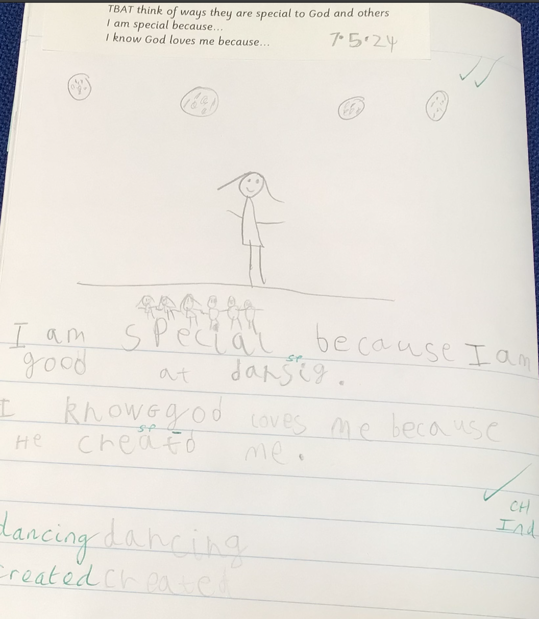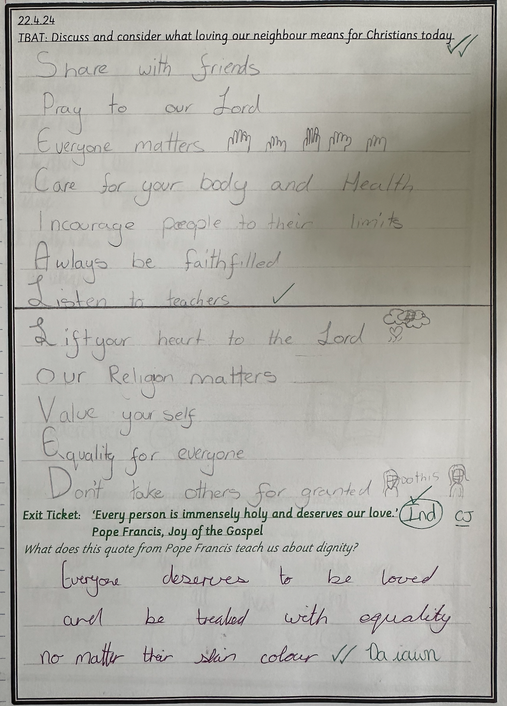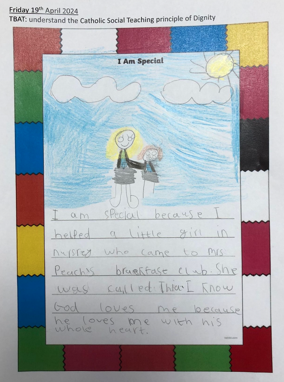 In our liturgy, the scripture reading taught us that God created humans in His own image and likeness, which means that we are special and valuable to God. We thought about how treating someone with dignity means treating them with love, kindness and respect and that everyone should be treated with dignity because we are made in the image and likeness of God.​ This means we should care for each other, help those in need, and stand up for what is right, just like Jesus taught us.
