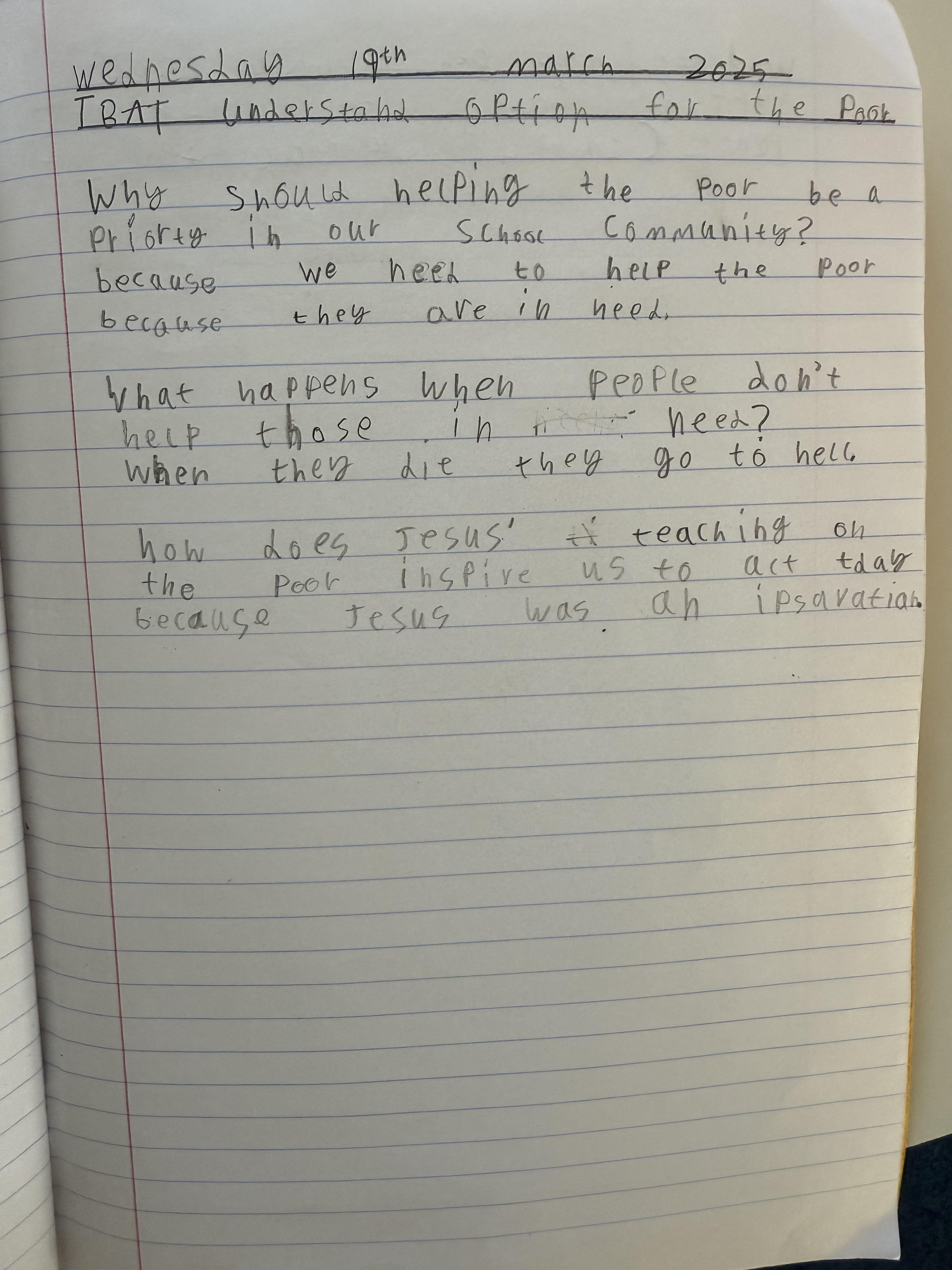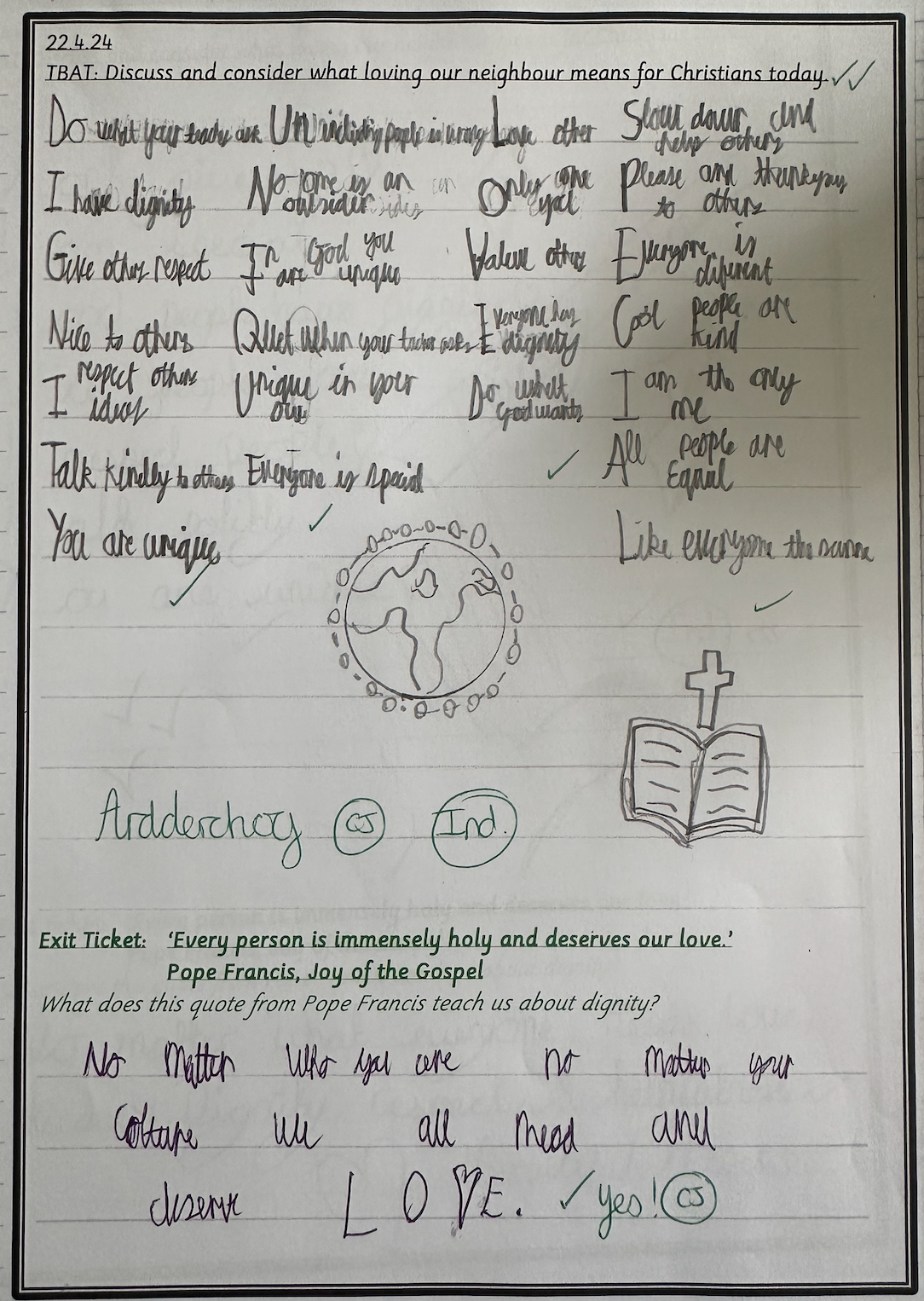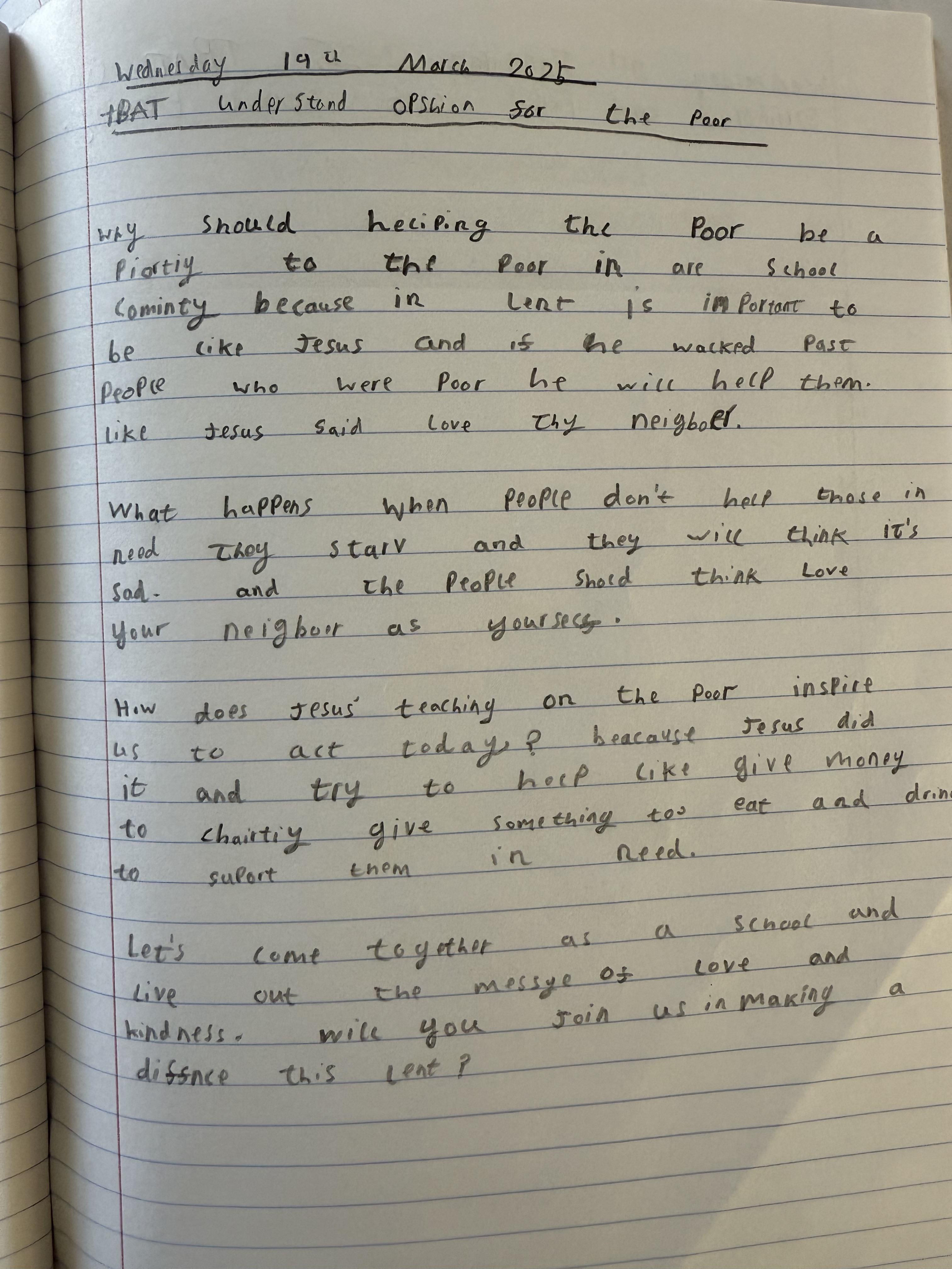 In our liturgy, the scripture reading taught us that God created humans in His own image and likeness, which means that we are special and valuable to God. We thought about how treating someone with dignity means treating them with love, kindness and respect and that everyone should be treated with dignity because we are made in the image and likeness of God.​ This means we should care for each other, help those in need, and stand up for what is right, just like Jesus taught us.