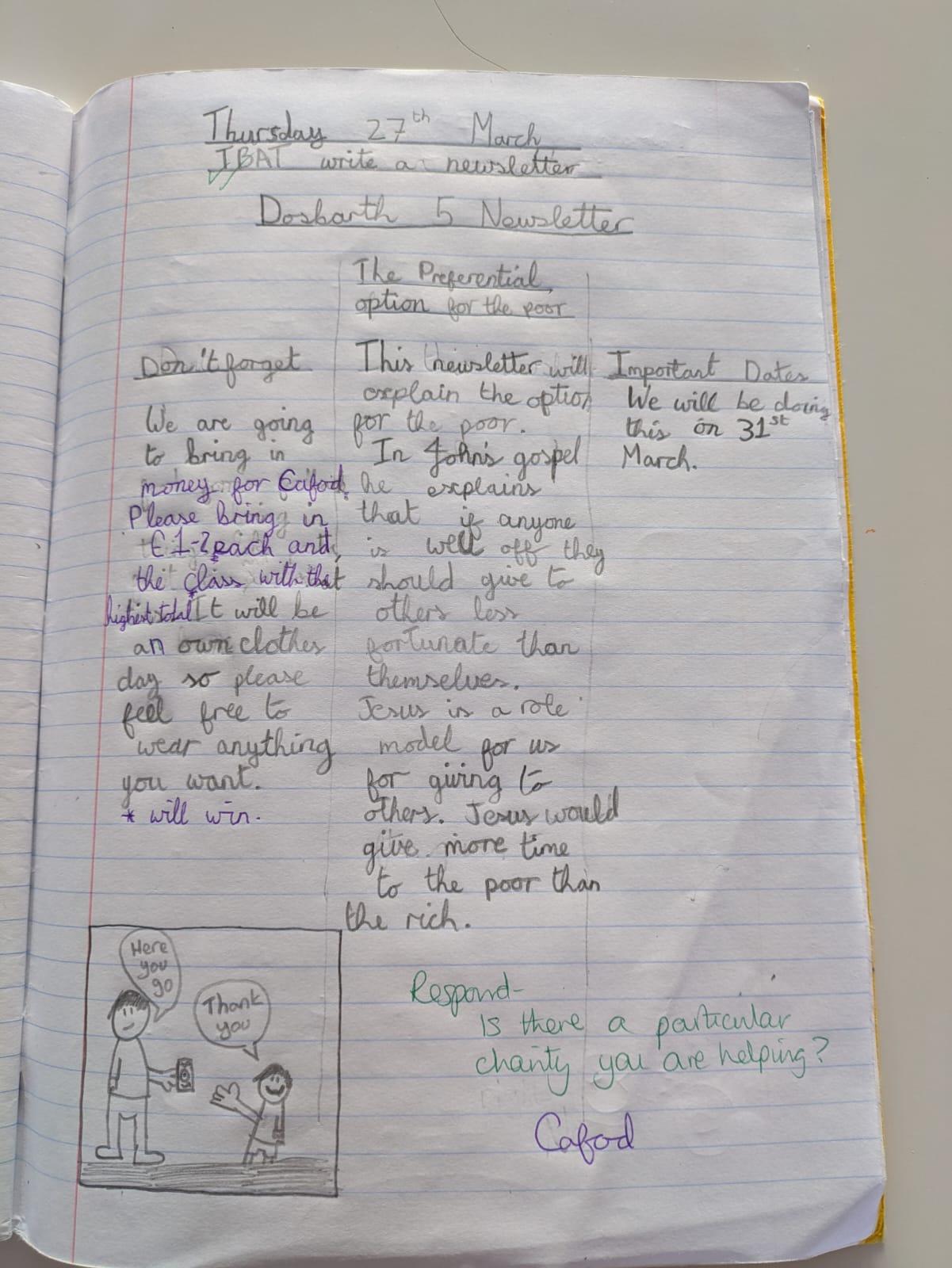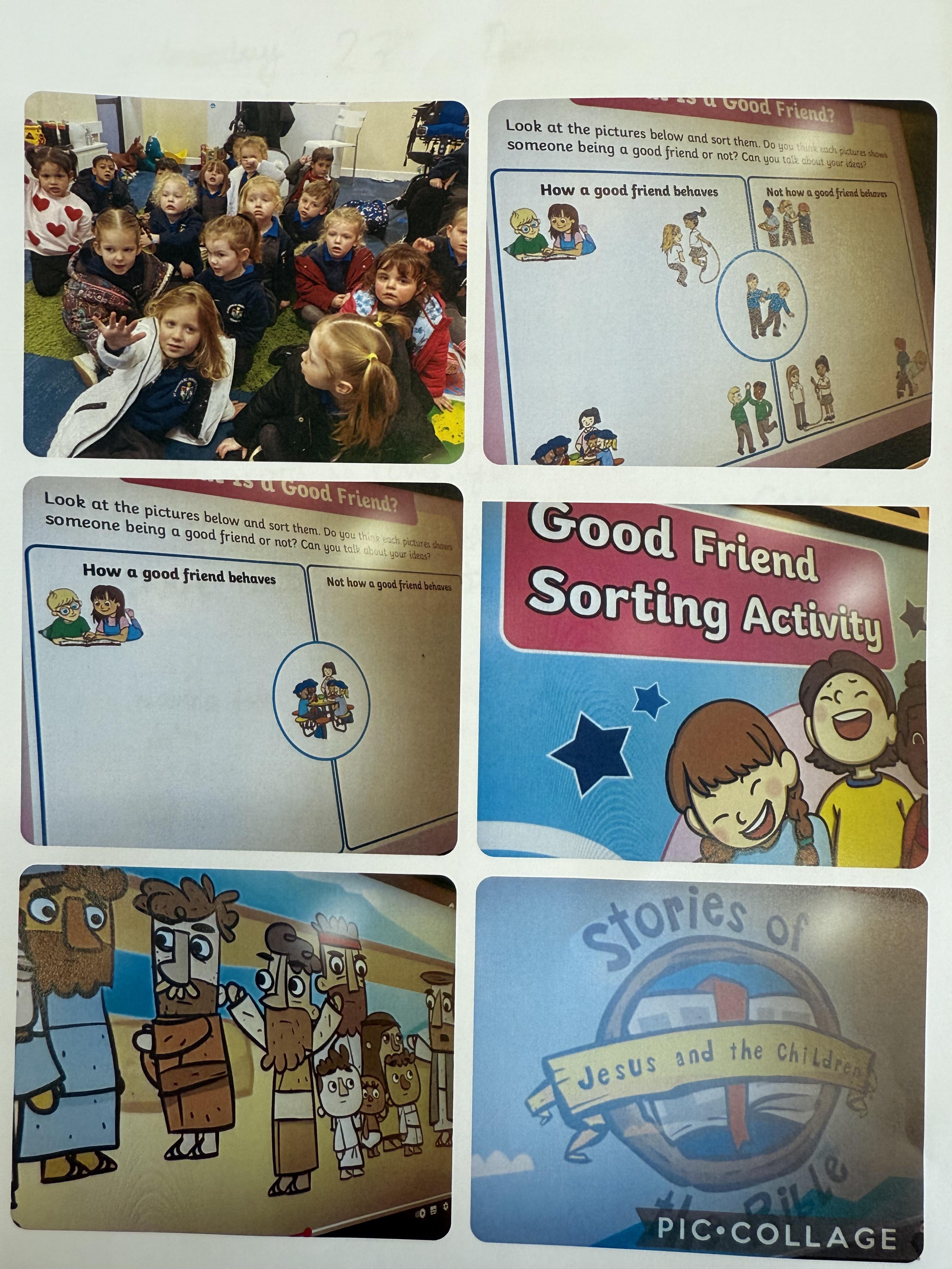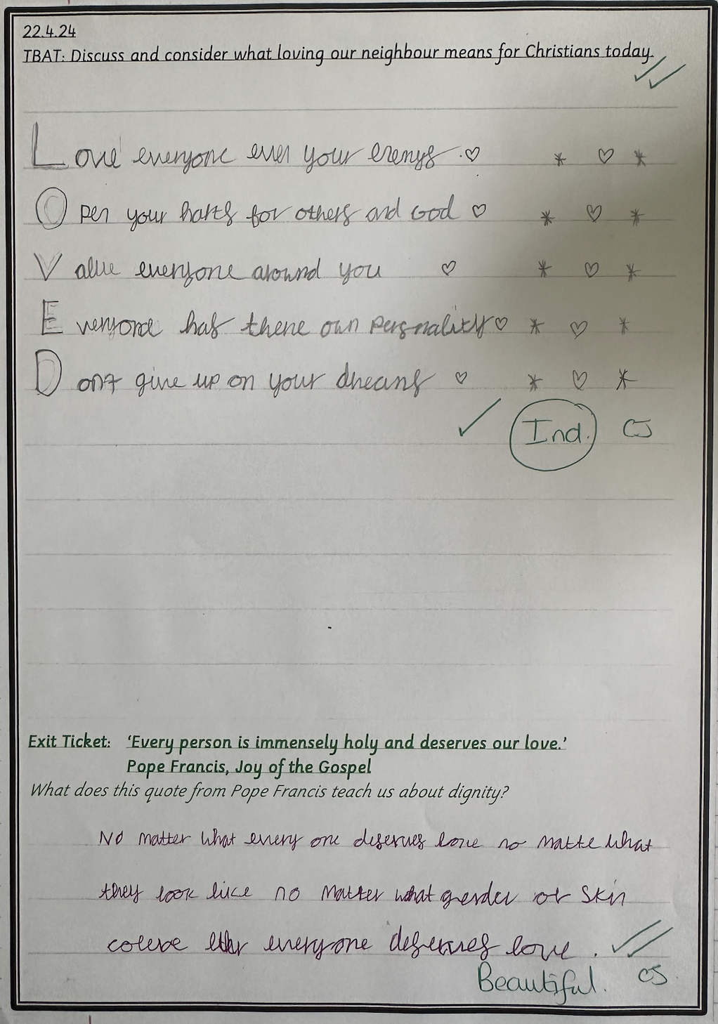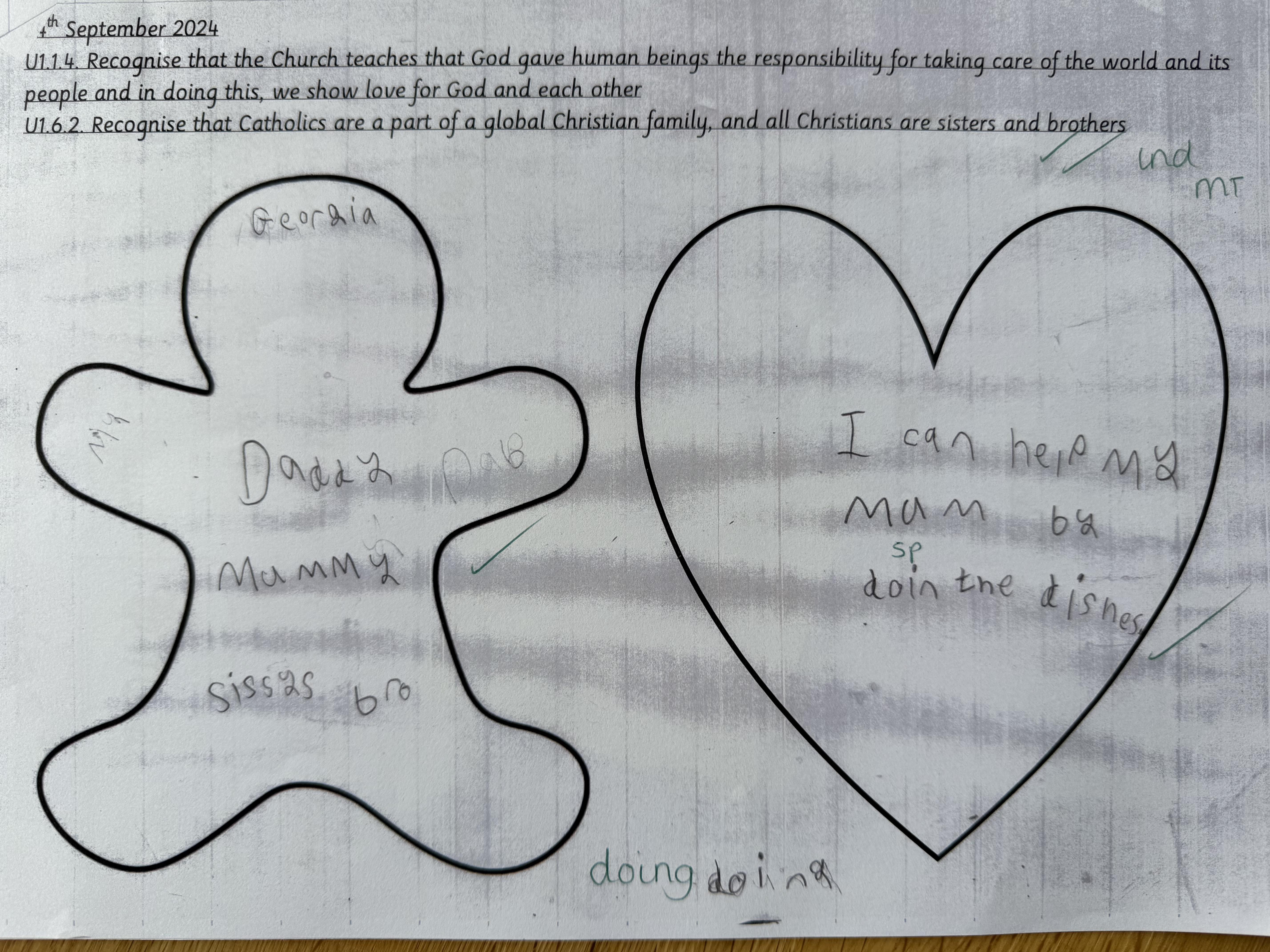 In our liturgy, the scripture reading taught us that God created humans in His own image and likeness, which means that we are special and valuable to God. We thought about how treating someone with dignity means treating them with love, kindness and respect and that everyone should be treated with dignity because we are made in the image and likeness of God. This means we should care for each other, help those in need, and stand up for what is right, just like Jesus taught us.