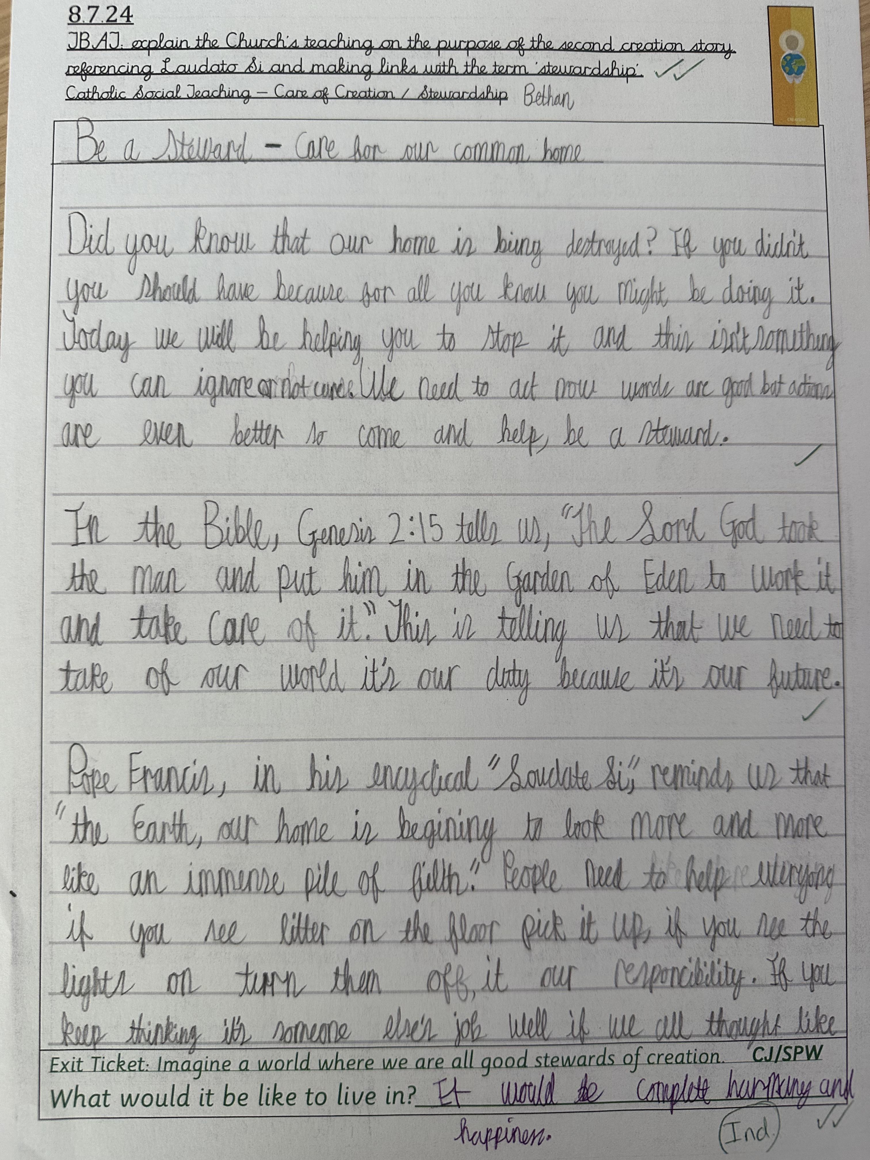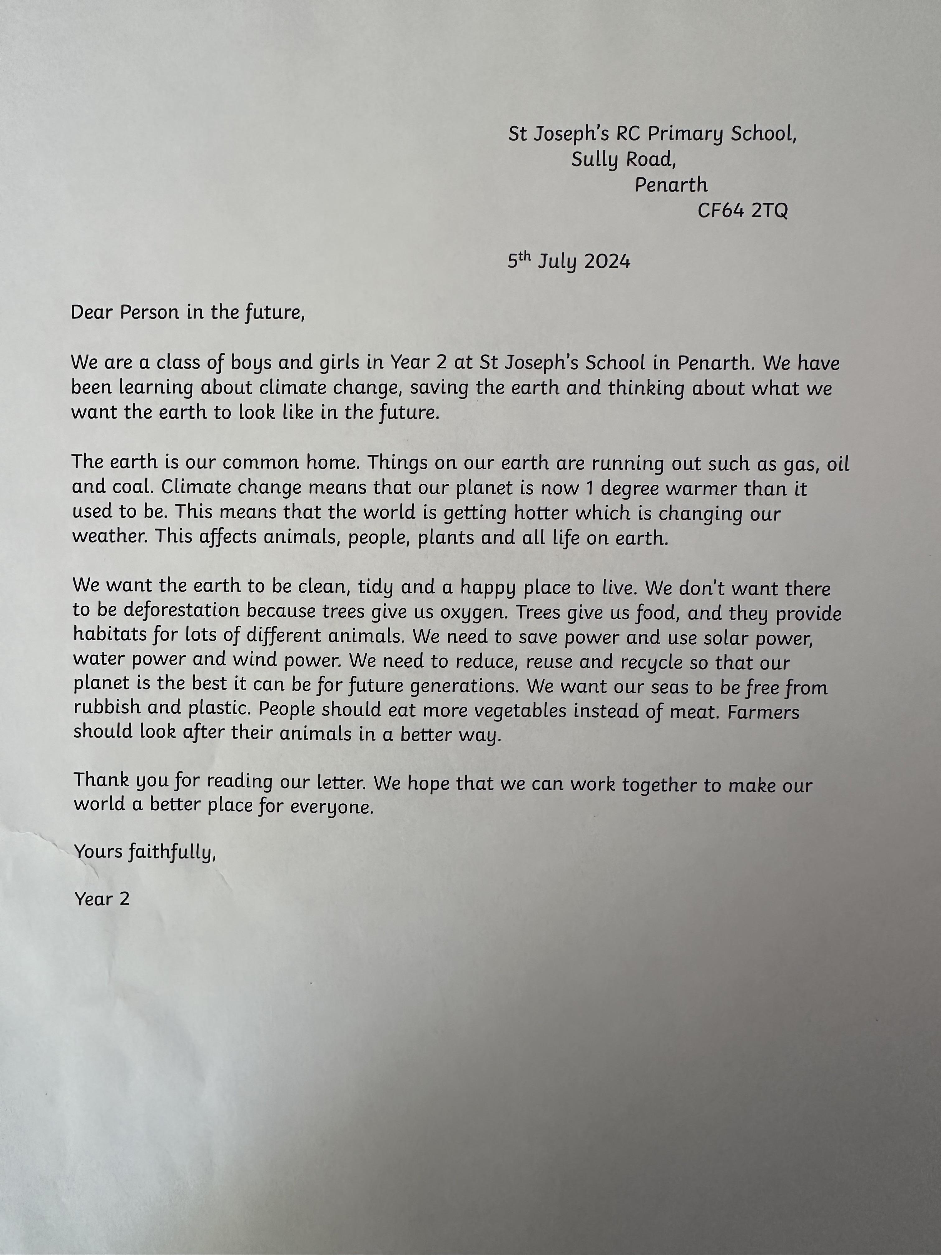 Pope Francis wrote a letter called Laudato Si’, addressed to everyone in the whole world, asking us all to take care of our common home. You can see an animation of his letter here: https://cafod.org.uk/education/primary-teaching-resources/laudato-si-for-children